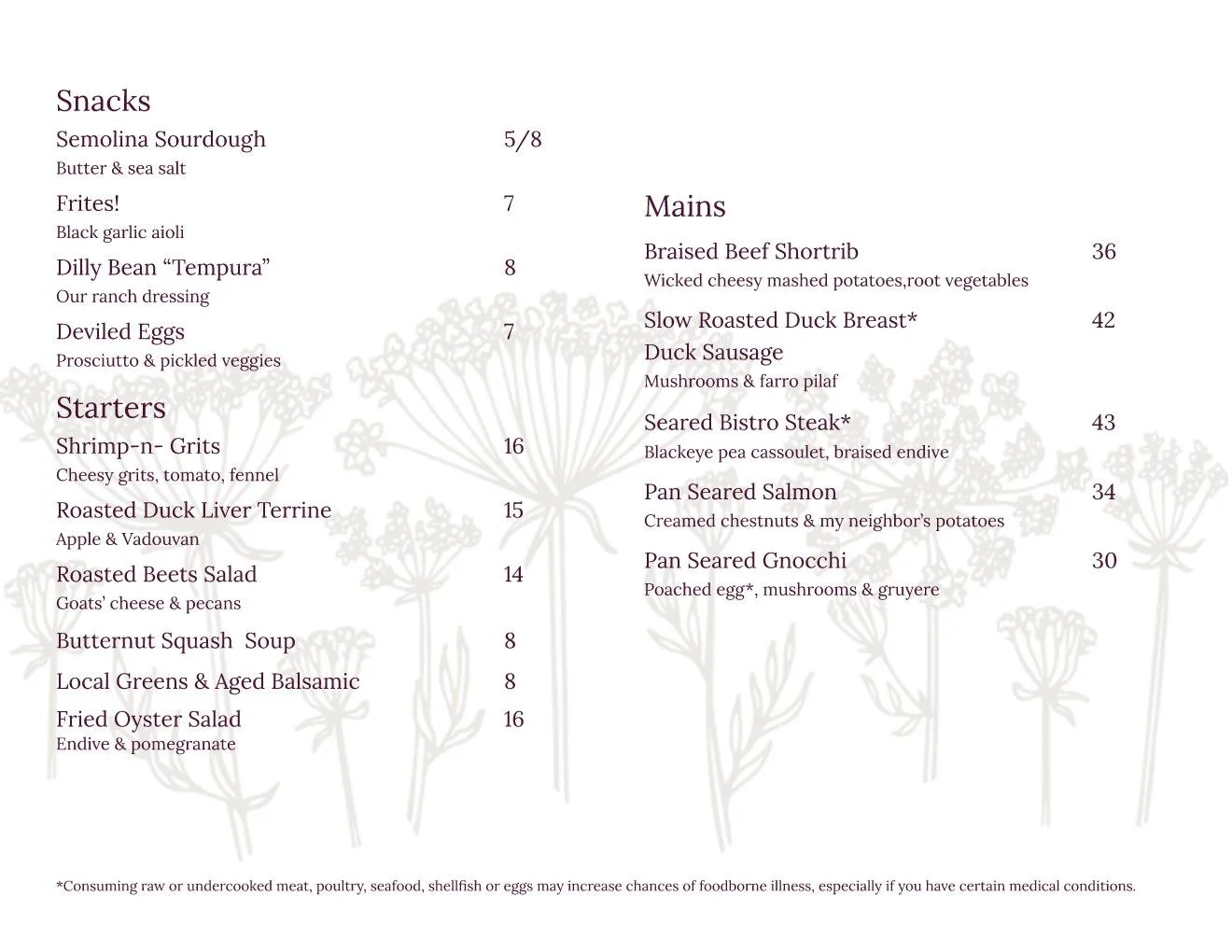 Our Menu Current Dinner Menu as of January 6th, 2026 Please note this is a sample menu, our menu changes frequently!